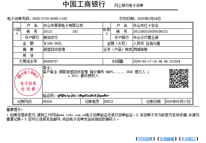 Recently, with the development of a new coronavirus-infected pneumonia epidemic, an outbreak has also occurred in Zhongshan City. At a time of severe epidemic prevention and control, Zhongshan Jingrong Electronics Co., Ltd. actively responded to the party ’s call and actively donated 500 yuan each to the Red Cross Society of Zhongshan City and the Red Cross Society of Xiaolan Town, Zhongshan City, for a total of 1,000 yuan. He purchases professional protective materials, and takes practical actions to support the national epidemic prevention and control work and medical workers who are fighting day and night on the front line to fight the epidemic.